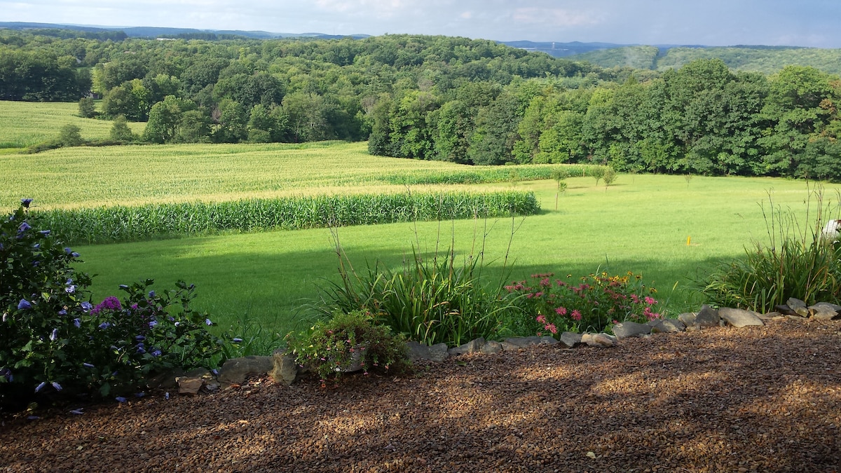 La casa de huéspedes es un estudio de 20 x 16 pies que se encuentra en 115 acres de bosques y campos con excelentes vistas a las afueras de Brookville. Se encuentra aproximadamente a 20 yardas de la casa principal y está equipada con una cama tamaño queen, un sofá, baño completo con ducha a ras de suelo y nevera pequeña, horno tostador, microondas y TV. La propiedad tiene múltiples senderos para caminar y se encuentra aproximadamente a 5 millas de la Ruta 80. También está cerca de Cook's Forest, el río Clarion y Punxsutawney.