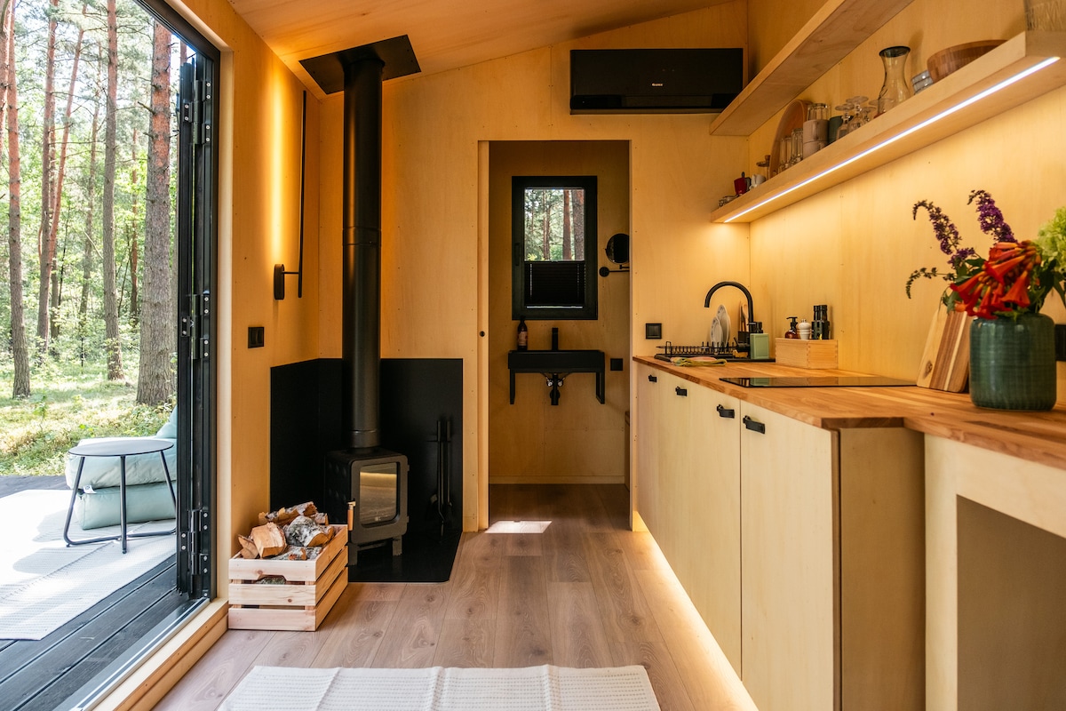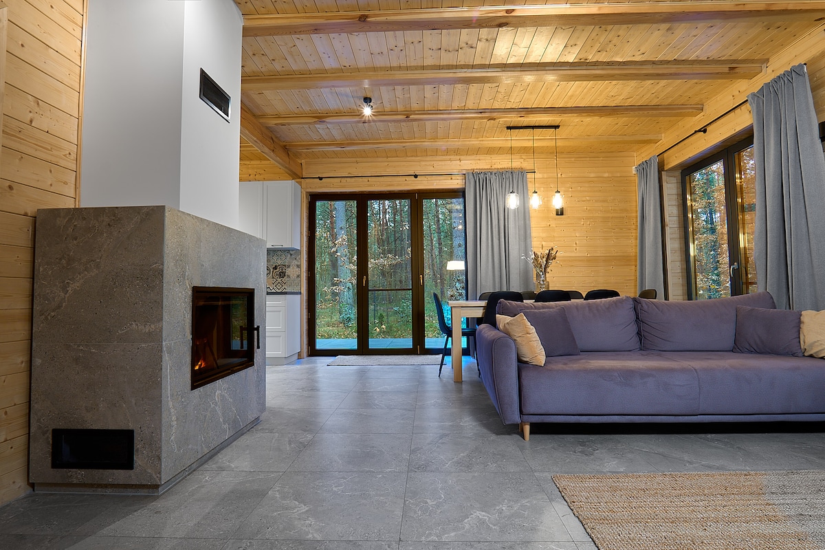 Cabaña spa estilo Hygge, cómoda, luminosa y natural. La cabaña es cómoda para dos huéspedes, pero puede alojar a 4 personas. Relájate en un baño de bosque de pinos y abetos con un jacuzzi al aire libre en la terraza y una sauna en la cabaña :) En los días fríos de otoño e invierno, también puedes disfrutar de la chimenea. El precio del alquiler incluye una bañera de hidromasaje, sauna, botella de gas para barbacoa y leña.