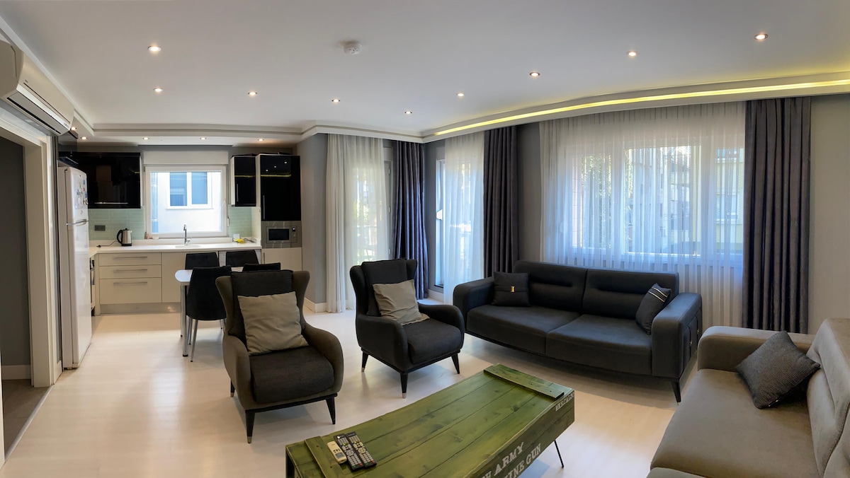 Estimado huésped, nuestro edificio no tiene ascensor. Nuestro apartamento está situado en una de las zonas más prestigiosas y turísticas de Antalya. Estará a solo 3 minutos a pie de rutas de senderismo y ciclismo con vistas al mar en altos acantilados, restaurantes y cafeterías, parques familiares. Estará a 10 minutos a pie del centro comercial Terra City y de la playa pública de Fener, donde podrá nadar en las rocas. Estará a 20 minutos a pie. Estará a 15 minutos en taxi de la playa de Lara.