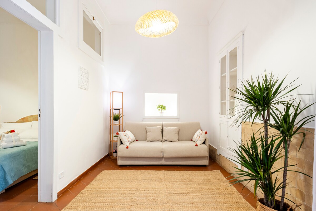 El departamento está ubicado en la planta baja de un pequeño edificio original en el centro histórico de Taormina, a pocos pasos de la Catedral y Corso Umberto. Hay pequeñas tiendas, restaurantes y cafeterías cerca. Un dormitorio queen queen con baño privado con ducha. No hay ventana en el dormitorio para garantizar noches tranquilas a pesar de la ubicación céntrica del departamento. Una pintoresca sala de estar con un solo sofá cama, un sillón y un comedor. Una cocina abierta pequeña pero totalmente equipada está conectada con la sala de estar