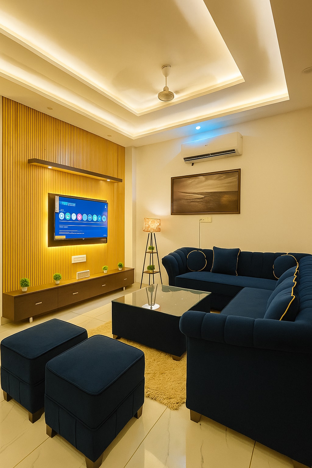 Disfruta de la comodidad y el estilo en un santuario diseñado para el trabajo y la relajación. Descansa en un colchón ortopédico Wakefit y disfruta de una cálida iluminación ambiental. Mantén la productividad con un espacio de trabajo ergonómico y relájate con dos televisores de 42 pulgadas. El baño adjunto ofrece artículos de tocador de primera calidad y un espejo de tocador iluminado. Cocina sin esfuerzo en una cocina totalmente equipada. Relájate en el sofá en un espacio donde la paz, la productividad y el estilo de vida se mezclan a la perfección.