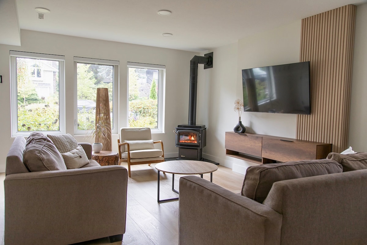 Guests love our top 5% home: sparkling clean, beautifully designed, and incredibly comfortable. Boutique-style suite with high ceilings, a luxurious king bed, and comfort better than a hotel stay. Enjoy a sunny living room, in-suite laundry, 1G Wi-Fi, 52" smart TV with Netflix, free coffee & tea, private entry, and free parking. Thermostat heating and naturally cool in summer. Walk to transit, parks, and trails; a short drive to shopping. Perfect for couples, families, solo, or business stays.