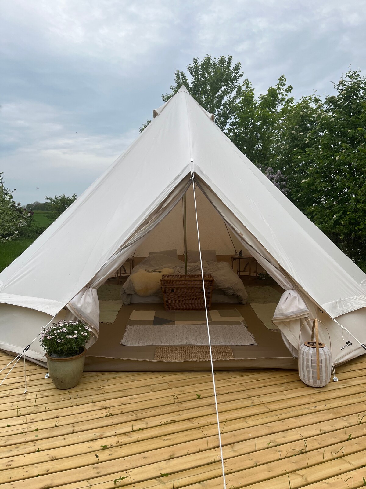 Har I lyst til campinglivet, men vil gerne sove lidt mere luksuriøst? Så prøv vores dejlige store Starglaze Glamping telt, med en radius på 6 m. Det er det eneste telt på marken. Teltet er udstyret med en dobbeltseng og ved 4 personer, er det tænkt som 2 voksne og 2 børn. Der vil være to madrasser der kan foldes ud til rådighed. Madlavningen vil foregå udendørs, der er et bålsted samt kul-grill til rådighed. Når I ankommer er sengene redte og der stilles også håndklæder rådighed.