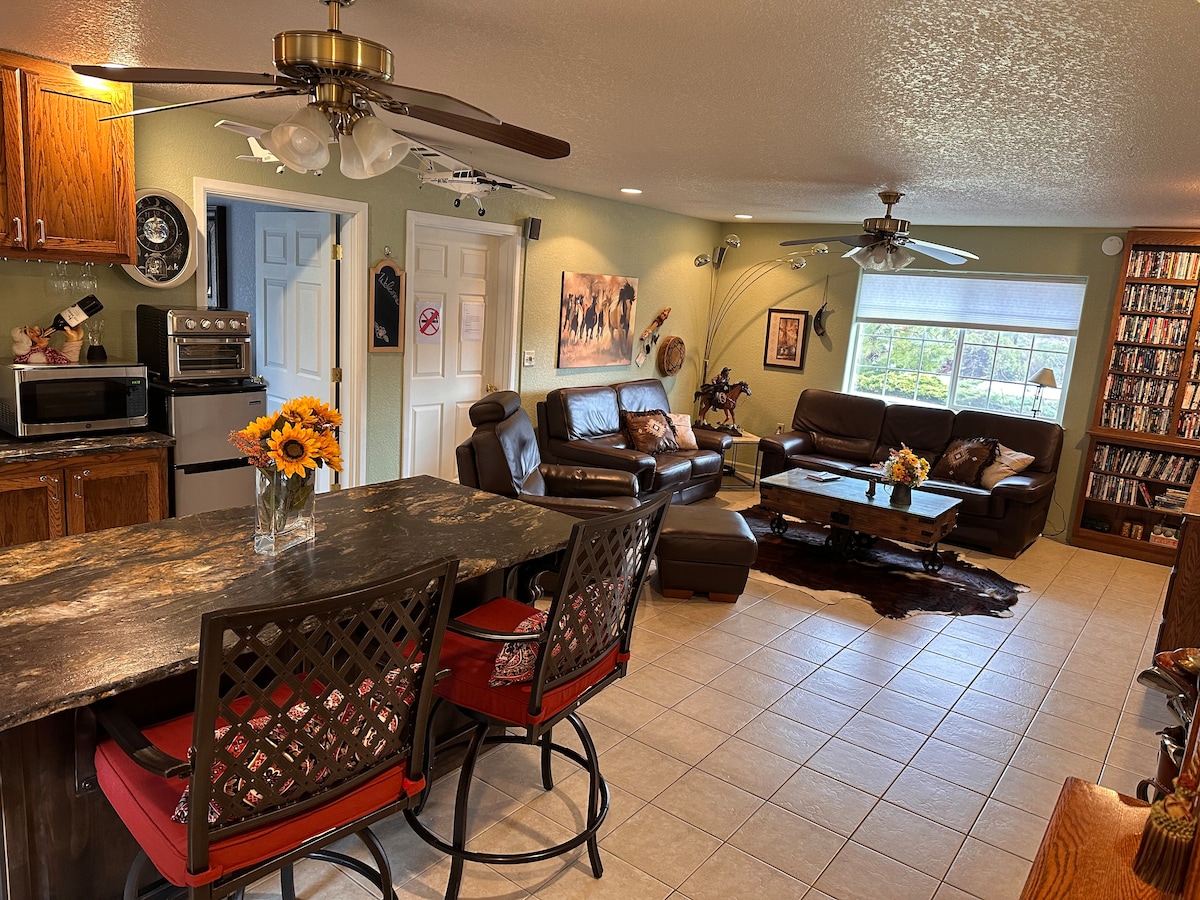 Tu estudio amueblado separado de 14 x 14 es agradable, acogedor y tranquilo. Está equipado con cafetera, hervidor de agua, horno tostador, sábanas frescas, toallas mullidas y una cómoda cama tamaño queen. A la izquierda de la residencia y junto al taller, tu estudio espera tu llegada. El patio, como un parque, tiene hermosas vistas a la montaña. El libro de bienvenida será tu guía para actividades cercanas al lago Siskiyou con senderismo, ciclismo, golf y restaurantes. Está a 2 millas de la ciudad. Gira a la izquierda por la entrada hasta tu acogedor estudio.