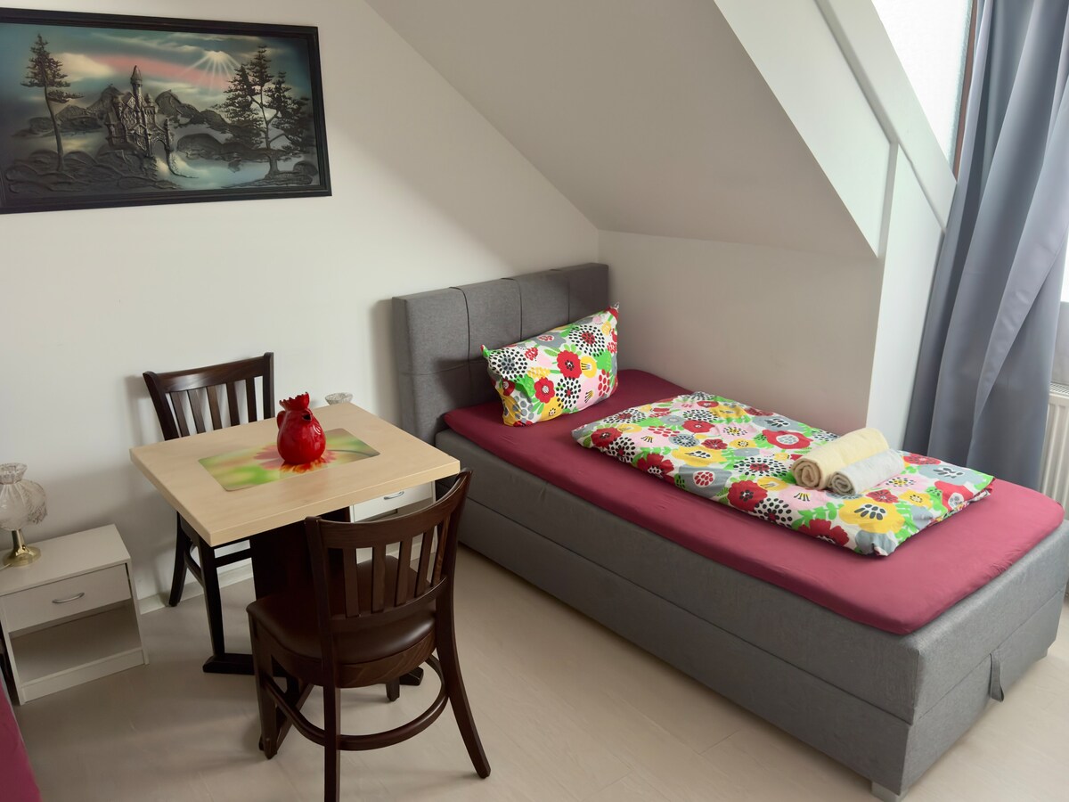 La habitación es ideal para cocina independiente con una pequeña cocina (nevera/congelador, estufa con dos platos, lavabo, cubiertos, ollas y cía.). El baño está equipado con una gran ducha, lavabo e inodoro. Dispone de armario, conexión Wi-Fi y TV con recepción vía satélite. Desde la ventana se tiene una vista directa de la UNESCO Patrimonio de la Humanidad "Hércules". Conexión directa a la A 49, A 44. Los precios incluyen ropa de cama y toallas. 01731586737