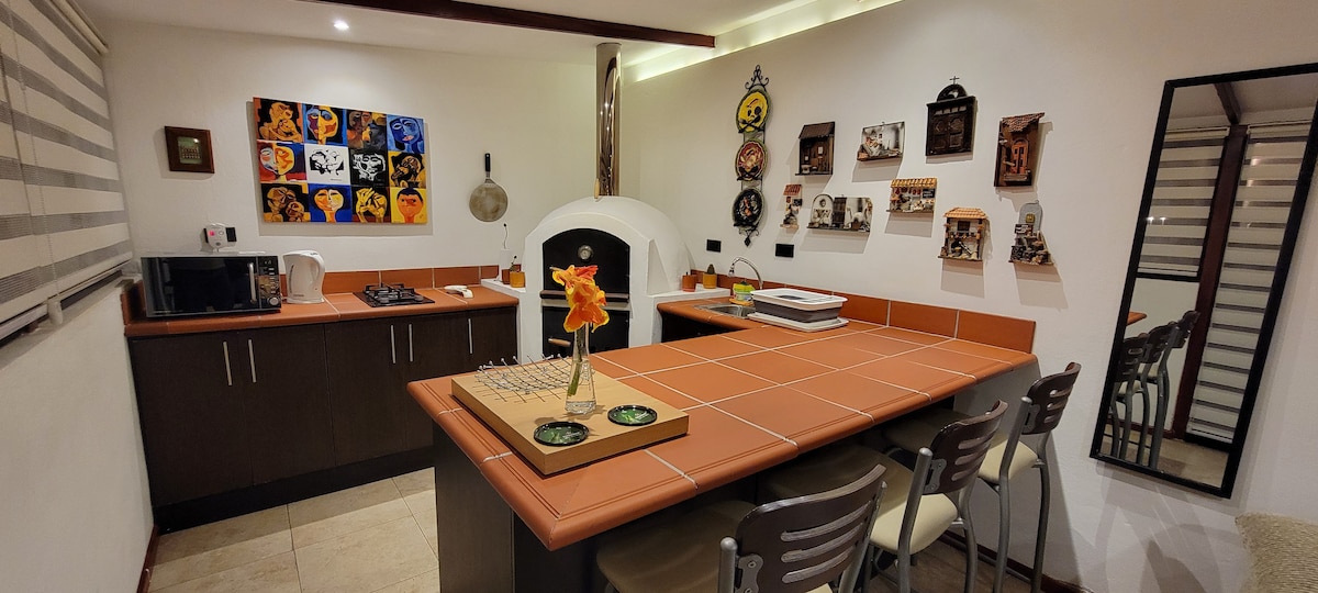 Mini suite totalmente privada a solo 300 metros de la estación El Labrador del Metro de Quito. Incluye horno de leña, BBQ y fogata. El baño y el sauna están separados y son para uso exclusivo de los huéspedes. Está en un barrio seguro con guardianía privada, acceso independiente y parqueadero exclusivo. Adicionalmente el huésped puede disfrutar de un jardín para su uso personal. La suite está ubicada en el centro norte de Quito, aceesible a toda la ciudad a través del metro de la ciudad.