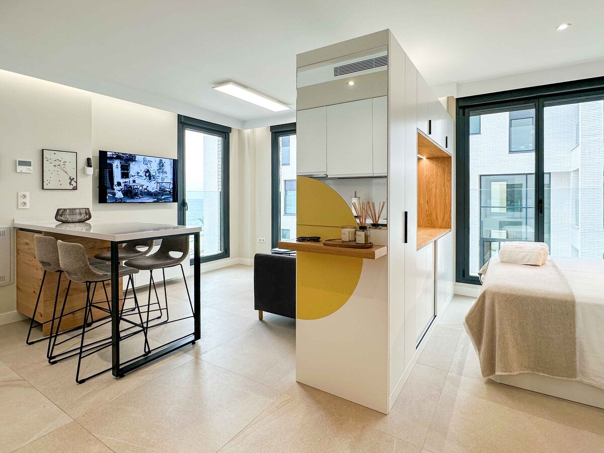 Espacio único en primera linea de playa con excelentes vistas al mar. Lujoso loft con cama de matrimonio y amplio sofá cama. Ideal para una pareja (con/sin niños) o nómada digital. (V)istas al mar desde la cama. Escucha su sonido mientras duermes (E)xperiencia. Espacio de trabajo situado en el mismo edificio de uso exclusivo con sala de reunión. (S)ostenibilidad: Edificio ECO. Construcción de 2024 con calidades premium. Dispone de Gimnasio e infinity pool. Lo esencial es invisible a los ojos