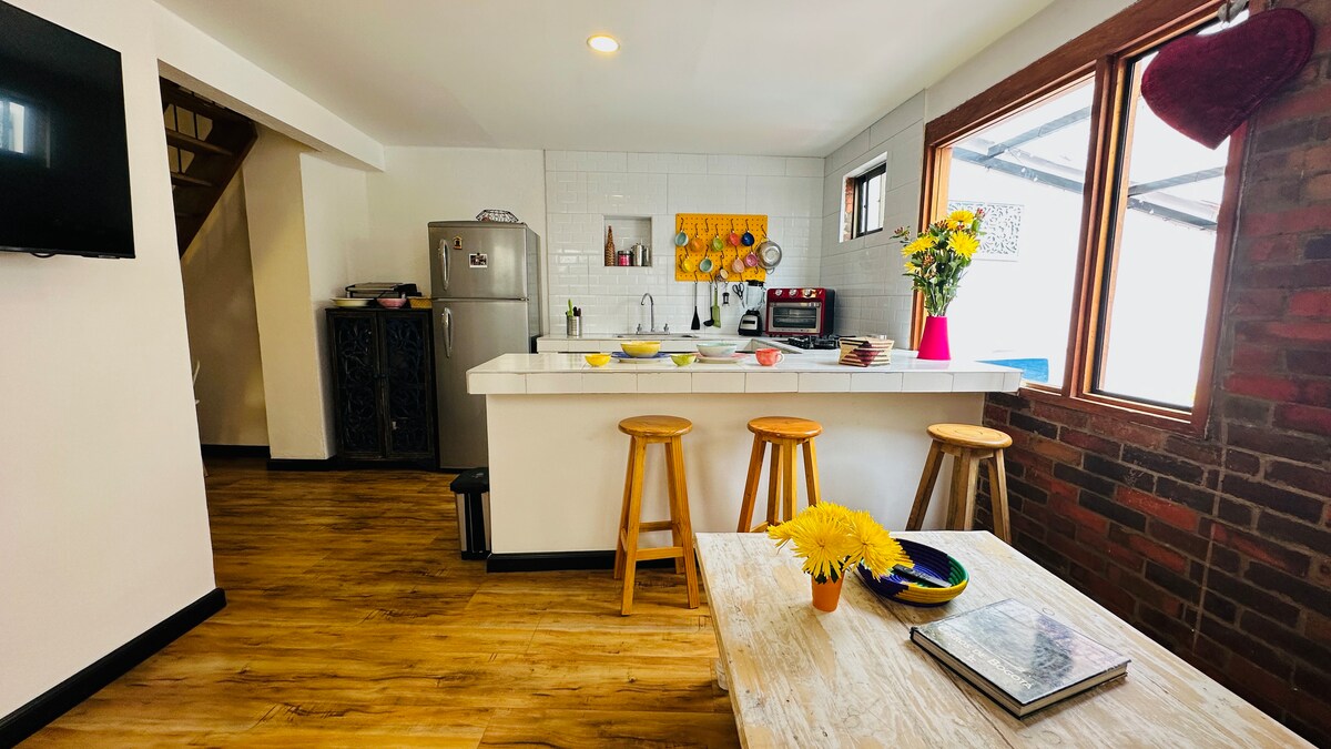 Hermoso apto en la calle mas linda del centro histórico. Romantico, autentico, acogedor, tiene mucha luz natural, temperatura agradable, hermosas vistas 360º a la ciudad y las montañas desde todos los espacios del apto. En el primer piso está la cocina abierta, sala, chimenea y balcón privado. Baño recién restaurado y habitacion con cama doble muy confortable y con ventana hacia la ciudad. Y para completar una linda experiencia, un altillo con vista al atardecer y hamaca para relajarse.