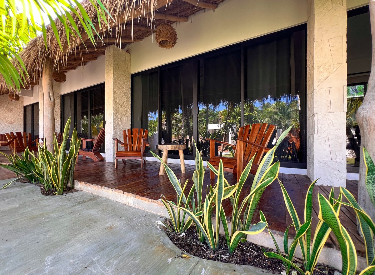 Escápate a nuestras elegantes y acogedoras cabañas en El Cuyo, a pocos pasos de la playa. Descansa en una cama tamaño king súper cómoda, relájate en la hamaca del entrepiso y disfruta cocinando a gusto en la cocina totalmente equipada. El baño está convenientemente ubicado en la planta baja. Sal a tu terraza privada y disfruta de un entorno relajado y natural, perfecto para bajar la velocidad, recargar energías y abrazar el ritmo relajado de la costa de Yucatán.
