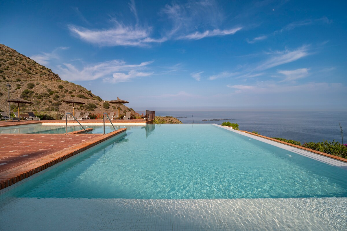 Ancón Suites, situado literalmente sobre la Playa del Ancón, en Carboneras, es el lugar ideal para pasar unos días de descanso y relax. Los apartamentos son tipo dúplex y todos cuentan con una mini piscina privada en la azotea donde poder relajarte con unas magníficas vistas. Están completamente equipados con todo lo necesario para pasar unos días inolvidables. Descubre el Parque Natural de Cabo de Gata desde tu maravillosa casa en Ancón Suites.