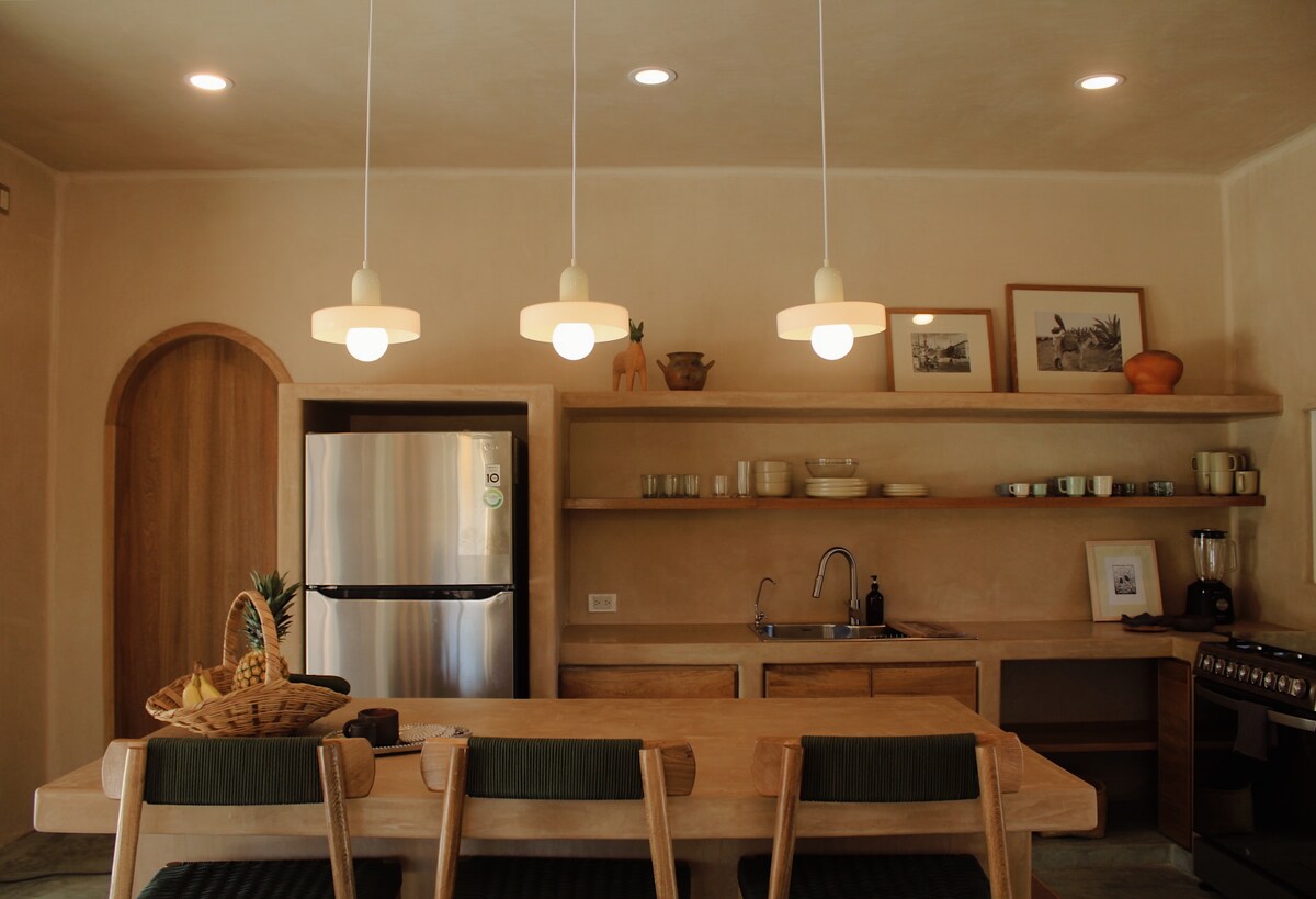 Casa con alberca y jardín privados a solo 2 minutos caminando de la playa, para 3 personas. Suite con cama king size y un sofá cama. También contamos con internet de alta velocidad (Starlink). Villa Andra nace de un sueño y homenaje a una madre. El sueño de vivir junto al mar y poder compartir este oasis contigo que buscas un remanso de paz. Fusión de culturas mexicana y mediterránea, un espacio acogedor donde hemos pensado cada detalle para tu comodidad.