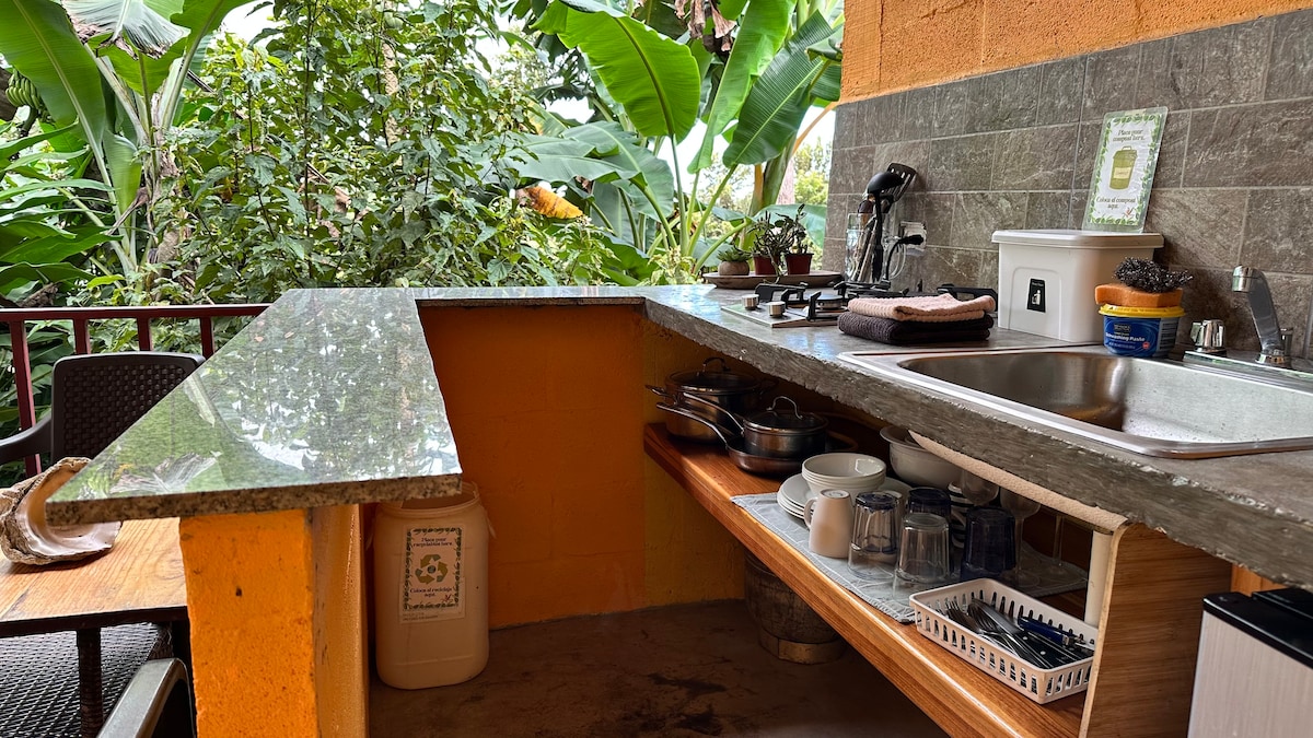 La Cabaña Sunrise es parte de 5 cabañas llamadas “A Piece of Paradise” y de la casa en la que viven los anfitriones. Registrados en la Autoridad de Turismo. ✸ Ideal para familias de hasta 4 ✸ Cocina y comedor exterior con vista a la naturaleza ✸ Barrio muy tranquilo ✸ 7-10 min., en auto, de Playa La Ermita y a 10 de Playa el Palmar (ideal para surfear) ✸ Transporte público y privado disponible, solo pregúntanos y te ayudamos ✸ Desayuno continental por $7.00 por cada persona, cada desayuno.