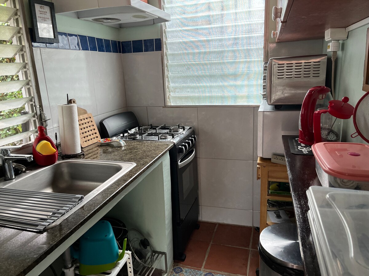 A cuadras de la playa en Playa Coronado, Panamá. Esta casita cuenta con dormitorio principal, sala pequeña que puedes usar como segundo habicatión, y baño privado, agua caliente, aire, TV y WiFi. Una cocina privada equipada con estufa, refrigerador, microondas, freidora de aire, etc. y una gran sala de estar al aire libre con hamacas. También tendrá acceso a una sala de lavandería y una piscina. Estacionamiento seguro disponible debajo del estacionamiento techado. Barrio tranquilo.