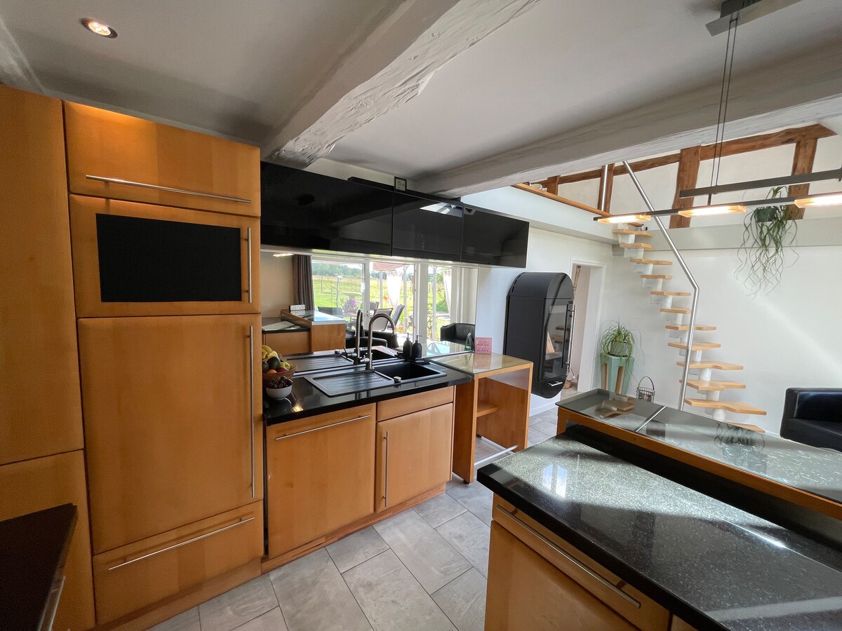 Du bewohnst ein Haus in einem denkmalgeschützten Fachwerkensemble von 1774 in direkter Umgebung von Detmold, ausgestattet mit Fittnes, Kino, Gartenlaube und freiem Blick auf den Teutoburger Wald. Komplette Küche, Infrarotsauna, gemütliche Stube mit Ofen- und Elektroheizung. Schlafzimmer mit Lehmwänden, ein zweites unter dem Dach. Garten vor dem Haus zur alleinigen Nutzung. Kinder und Haustiere willkommen. Supermarkt 1,1 km, City 3,5km entfernt. Elektrische- oder Ofen- Heizung Brennholz incl.