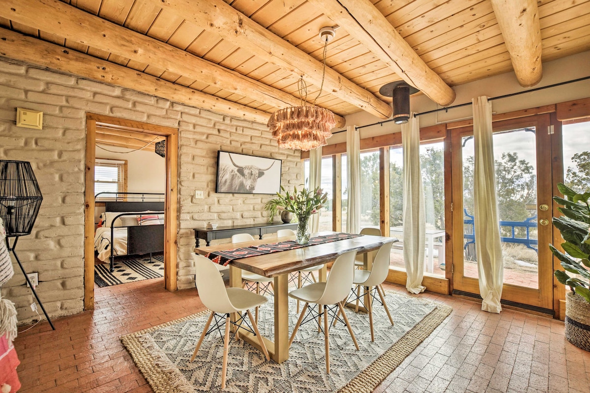Family Friendly | Tranquil Outdoor Area | Fireside Relaxation | 15 Mi to Canyon Road Galleries The 'Adobe Bungalow' is a vacation rental in Santa Fe — a private three-bedroom adobe home on just over an acre of high desert land. Thick walls, brick floors, a kiva fireplace, and a patio where the mountains go from gold to rose to deep indigo. This is a place to reset. Head into town for galleries, the Opera, or Ten Thousand Waves. Come back to open land, starry skies, and quiet.