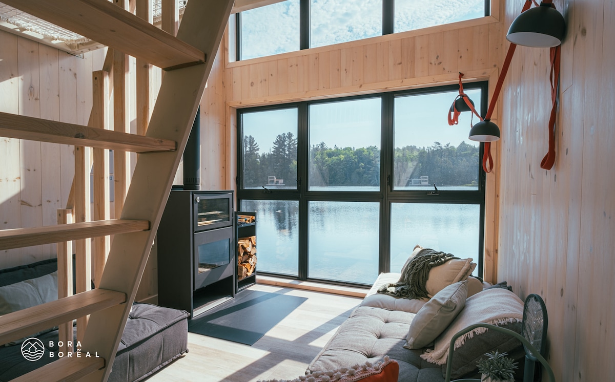 Cabaña flotante — Minibora Le bolet (máximo 4 huéspedes) Una sala de estar luminosa y acogedora: - Puerta de garaje de vidrio para una experiencia inmersiva frente al mar. - Cocina totalmente equipada y barbacoa privada Distribución de las camas: - Dormitorio de concepto abierto con una cama doble. - Sofás modulares: 2 camas individuales o 1 cama doble. Incluido: - Leña - Café tostado localmente. - 11 cervezas artesanales Comtés - Surf de remo y kayaks en verano - Raquetas de nieve en invierno Se admiten perros (cargo adicional) CITQ: 302677