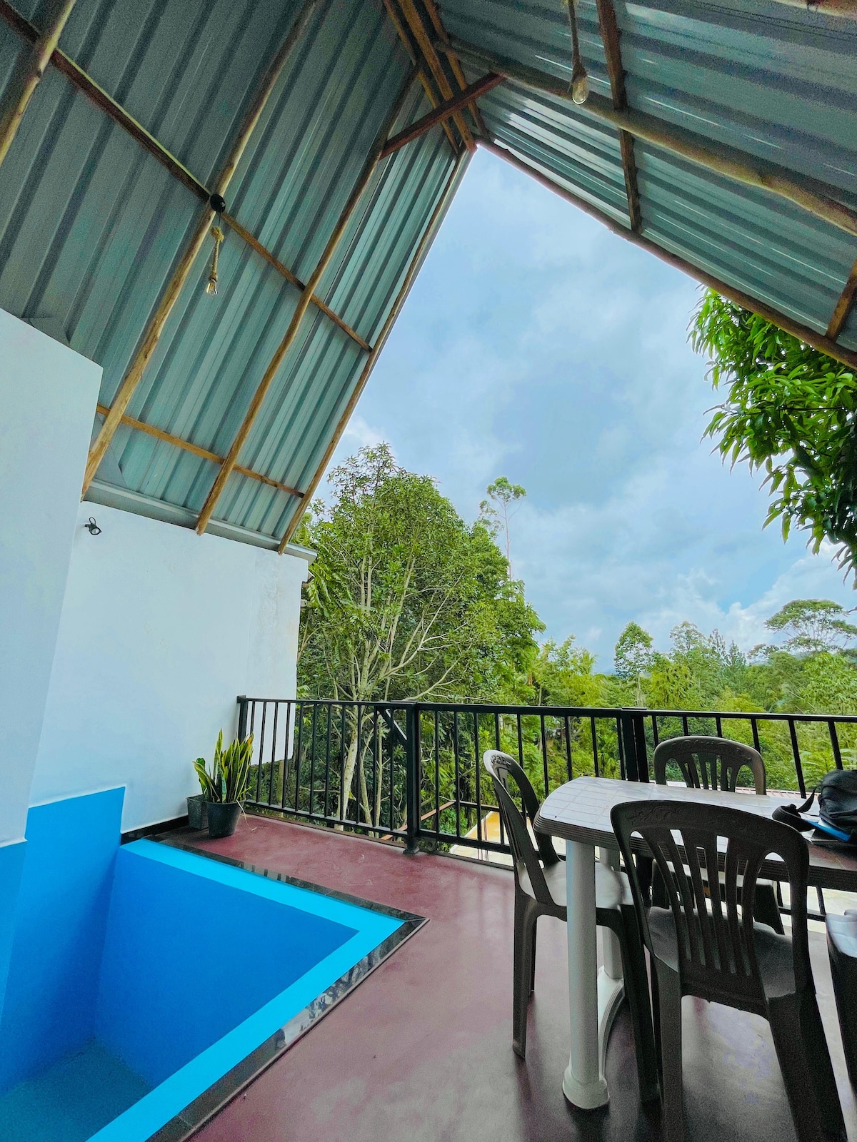 Experiencia First A Frame en Ella, Sri Lanka. Tea Cabins es tu escondite perfecto en una exuberante finca de té verde. Aislados y apartados, nuestros huéspedes nunca necesitan salir de la cabaña ni conocer a nadie. Disfruta de una experiencia única, escápate y concéntrate en los demás en la piscina privada con una chimenea al aire libre con vistas ininterrumpidas. Mira el tren pasar desde la cabaña y en 25 minutos a pie llegarás al famoso puente de los Nueve Arcos. ¡Este es tu escondite perfecto para escapar del bullicio de la ajetreada Ella!