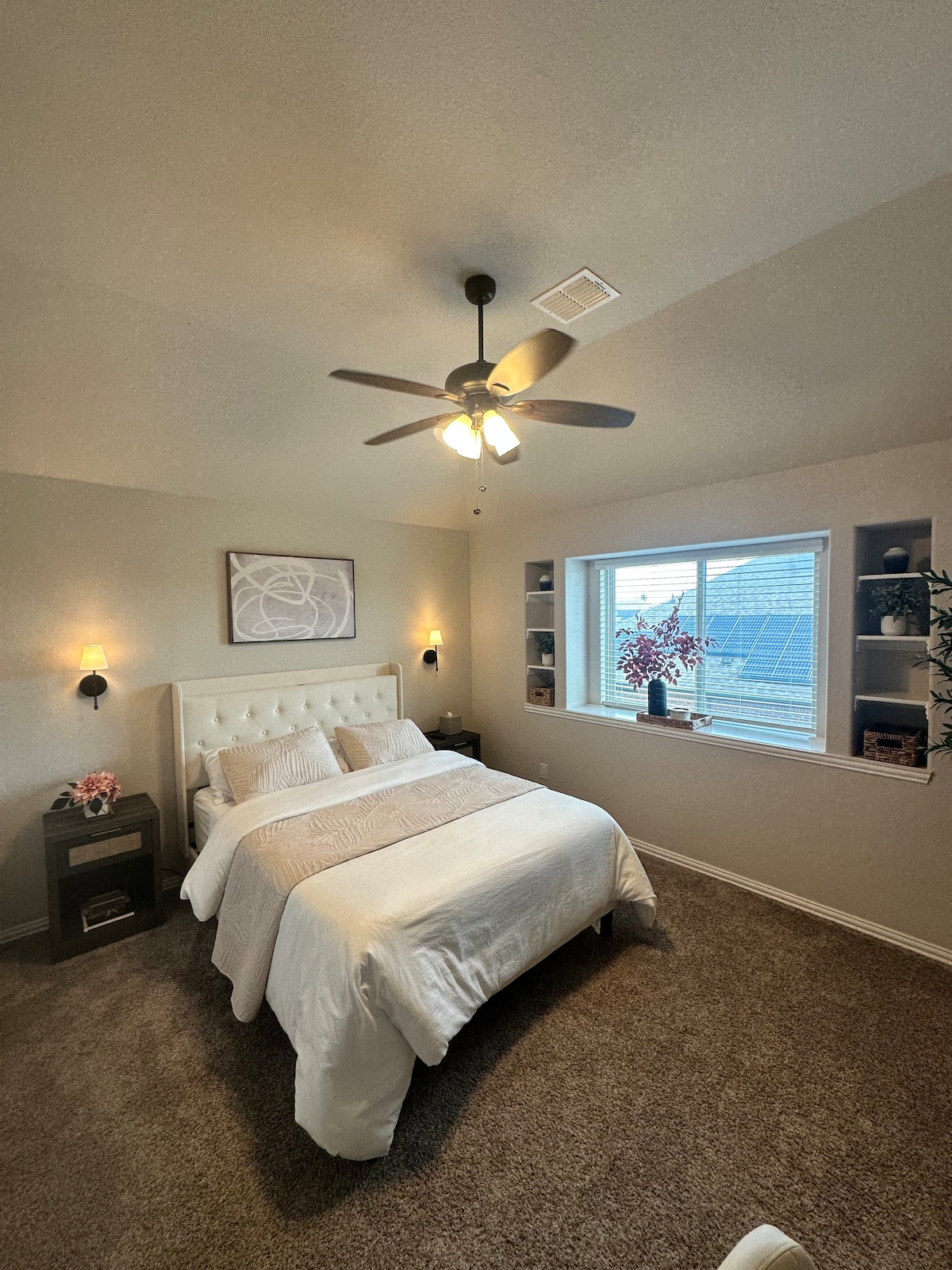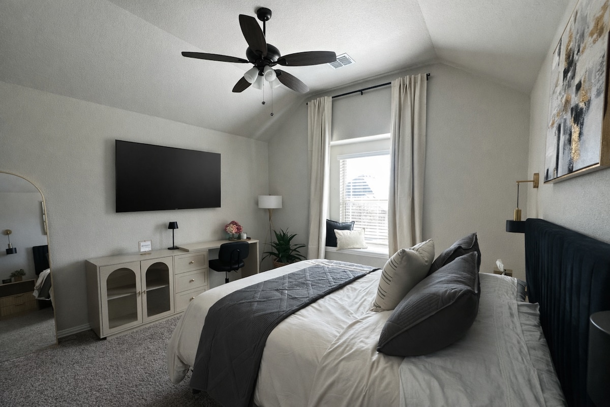 This is a private upstairs bedroom located in a shared home. The room includes a dedicated work desk and is ideal for couples or business travelers. The full bathroom is located just outside the bedroom in the hallway and is currently dedicated exclusively to this room. The guest space is on the second floor and requires stairs. Hosts live on-site downstairs. Guests have access to shared amenities including the full kitchen, pool, hot tub, garage gym, theater room, and outdoor living spaces.