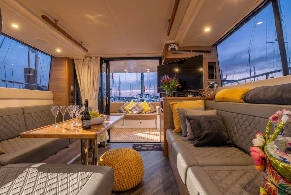 ¡TOTALMENTE CLIMATIZADO PARA EL INVIERNO! Una maravillosa oportunidad para alojarse a bordo de un hermoso y espacioso yate a motor amarrado en el prestigioso puerto deportivo Town Quay, Southampton. Ideal para parejas, familias o amigos que buscan una escapada emocionante o romántica. Hasta 7 huéspedes. 3 dormitorios con 3 baños. También hay paquetes a medida disponibles que incluyen recepción de champán, cumpleaños/decoraciones, estacionamiento seguro de cruceros/traslados, etc. Si necesitas más información, no dudes en ponerte en contacto con nosotros. Nuestro precio base se basa en 2 huéspedes, los huéspedes adicionales cuestan £ 25pp