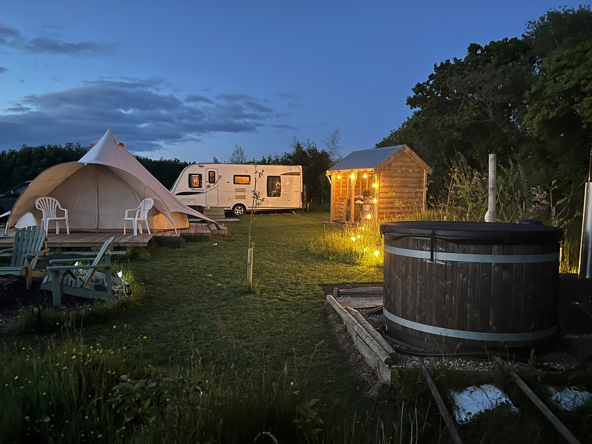 Caravana y tienda de campaña en un lugar rural con jacuzzi