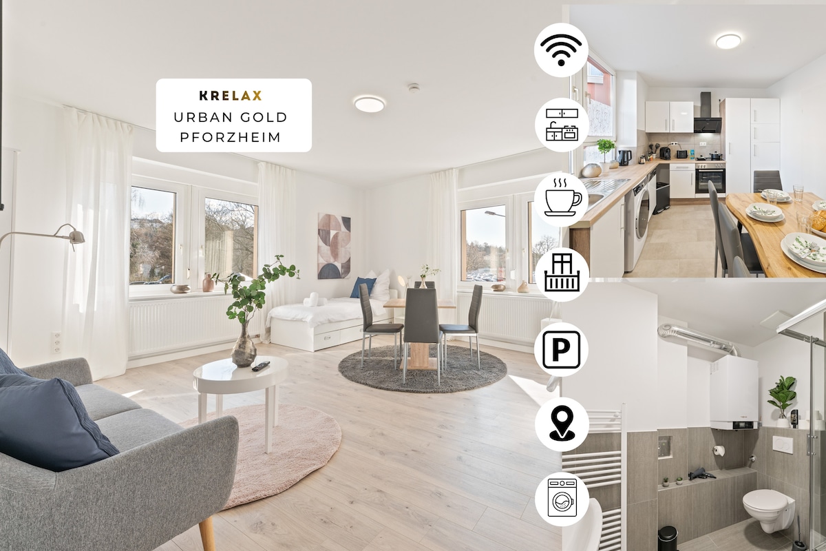 LA MEJOR UBICACIÓN: El apartamento de 2 habitaciones se encuentra en el tercer piso de un edificio de nueva construcción en el centro de la ciudad de Pforzheim. MÁS CÉNTRICO IMPOSIBLE: Todo lo que necesitas está justo delante de la puerta. Cafeterías, restaurantes (también con un gran desayuno), cervecerías al aire libre, supermercados, zona peatonal... todo está en las inmediaciones y a 2 minutos a pie. El Centro de Congresos y el teatro también están a la vuelta de la esquina. La estación de tren está a unos 10 minutos a pie.