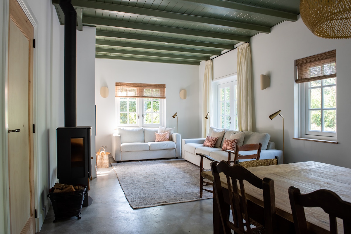 ¡La escapada perfecta! La casa de campo está situada en una pequeña finca familiar, en un hermoso bosque, a las afueras de un pueblo (a solo 600 metros ), en la zona natural más grande de los Países Bajos, con bosques antiguos y vastos campos de brezo en su puerta. La casa es espaciosa pero también acogedora y cómoda, con un baño de lujo, cocina completa, una estufa de leña y todas las demás comodidades que necesites. Si tienes suerte, a veces se pueden oír a los lobos aullar...