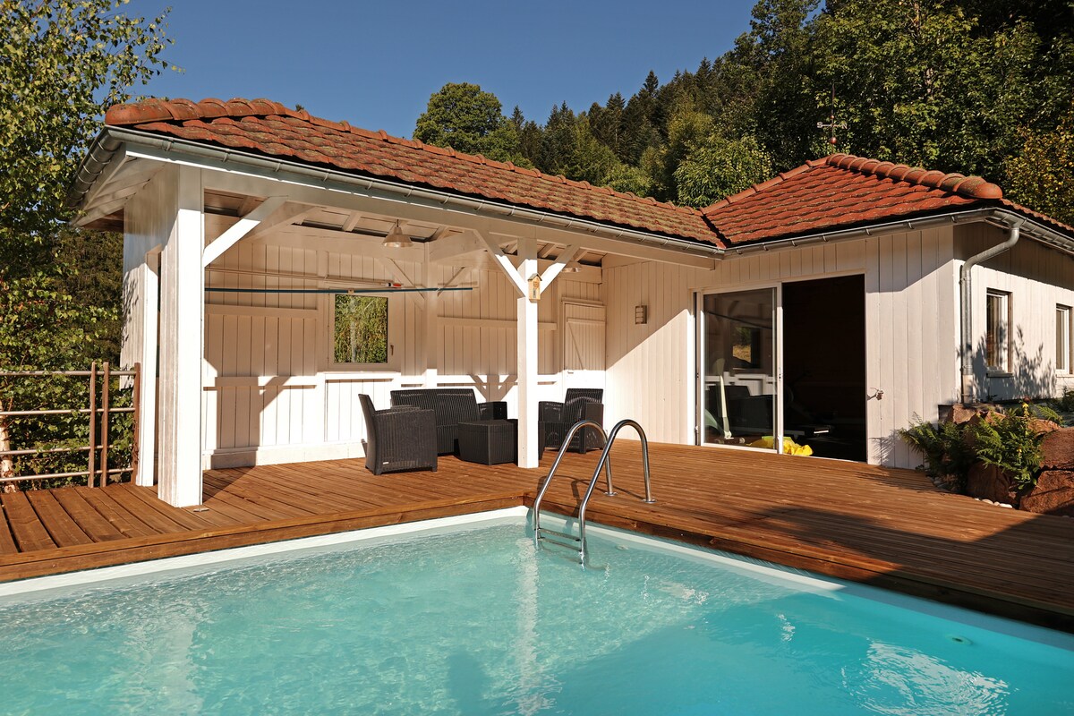 Disfrute en familia de este fabuloso chalet situado en el borde del bosque construcción piedra y madera. Piscina climatizada de mayo a septiembre con ducha exterior, gimnasio, amplio garaje, parque infantil, ping pong, minibillar y futbolín, libros para adultos, vistas panorámicas a las pistas de GÉRARDMER y Hohneck, 5 dormitorios con 4 camas tamaño queen, 3 con TV y aire acondicionado, ropa de cama 100 % Vosges terre texile, 2 baños, 1 con bañera, lavadora y secadora, secador de pelo, tabla de planchar, wifi