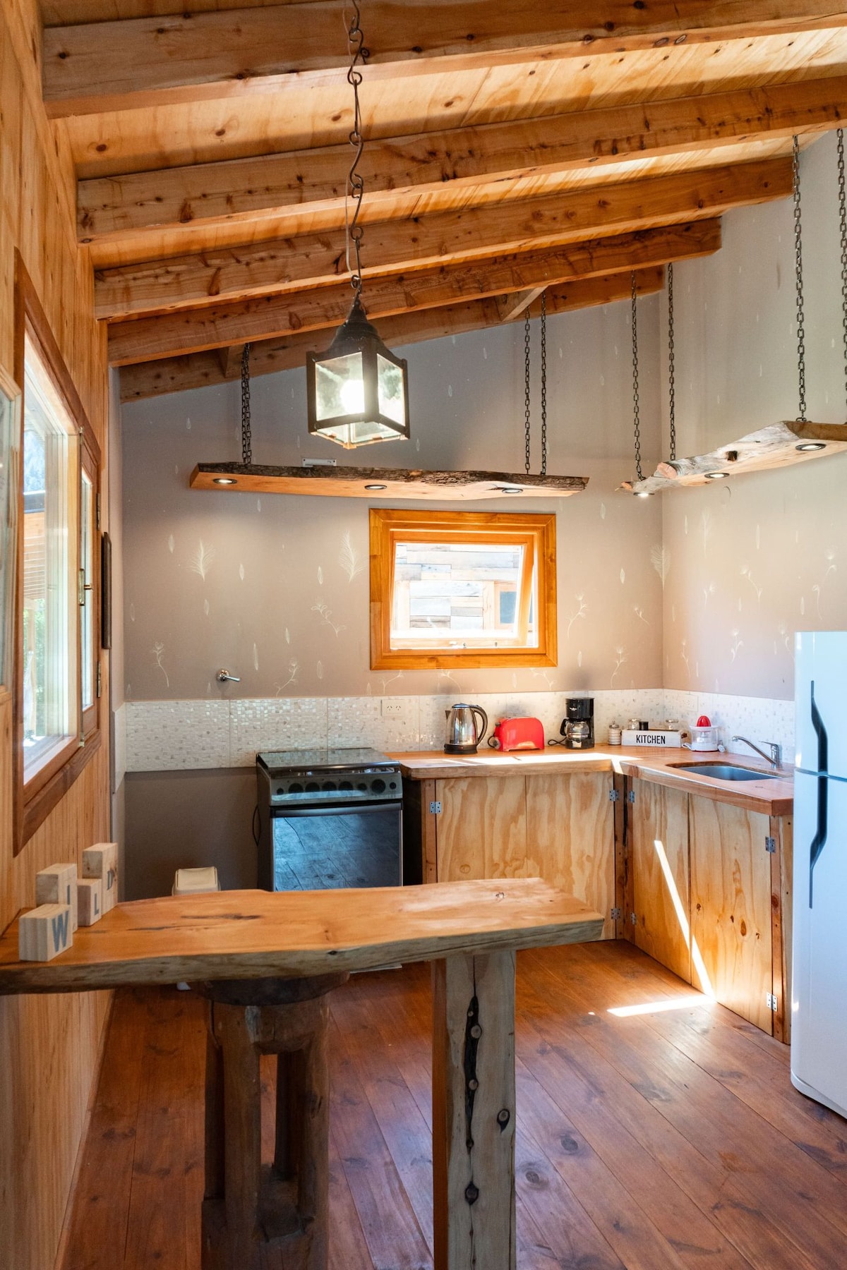 Cabaña loft de montaña moderna y rústica, ubicada frente al “km alfajor” de la Ruta 40 en Lago Puelo, con vistas a cerros y bosque. Ideal para 2/3 personas, cuenta con cama queen y sofá cama, WiFi, zona de trabajo, cocina equipada, estufa a gas, estacionamiento privado y área chillout con vista al cerro Piltriquitrón y espacio relax en el bosque.