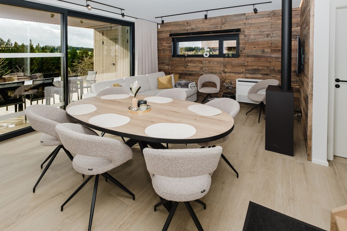 Endroit magnifique et luxueux, wellness, feu ouvert, piscine extérieure en été, spa de nage à contre-courant en hiver, jacuzzi extérieur, billard, fitness, salle à manger japonaise. Salon avec feu ouvert, cuisine confortable, véranda avec vue magnifique, 5 chambres chacune avec salle de bain privative. Jardin, bbq, meubles de jardin, séjour de minimum 2 nuits. Parking 5 voitures. Borne de recharge. Pas de groupe de jeunes (>30 ans). Possibilité suivant disponibilité de départ tardif le dimanche.