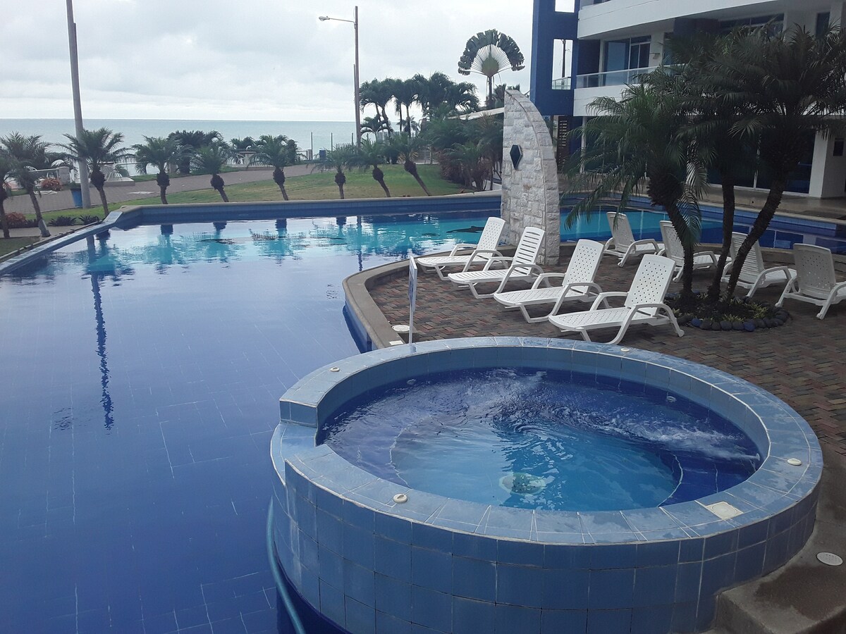 apartamento con vista al mar y acceso directo a la playa. Jacuzzi privado en el balcón, Wi-Fi de alta velocidad, acceso seguro con guardia de seguridad. Tendrá dos habitaciones, dos baños, y cinco camas disponibles, ideal para 6 personas,se dispone de lavadora en el apartamento y agua caliente. El complejo ofrece gimnasio, piscinas, sauna, turco, restaurante/bar, club de baile, piscina con juegos infantiles, cancha de fútbol ,tennis y Golfito LEER INSTRUCCIONES PARA EL INGRESO AL DEPARTAMENTO