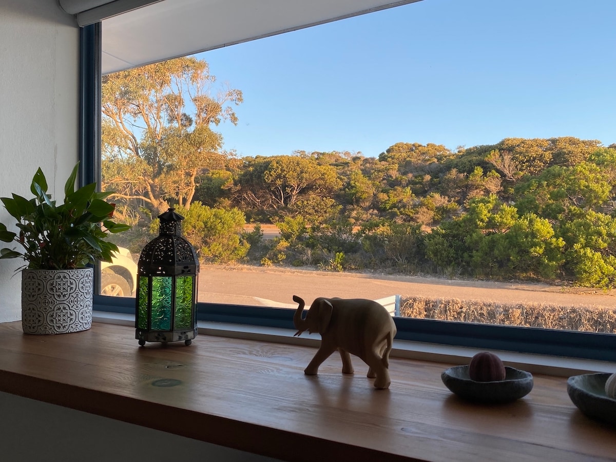 Mi casa tiene preciosas vistas a Dempster Head Rock y a las impresionantes aguas de color cobalto de West Beach. Nuestra calle es tranquila, justo arriba de la colina del CBD, lejos de las tiendas. Tu unidad está completamente separada con un dormitorio grande de estilo playero, vistas al mar y un gran vestíbulo de baldosas blancas que conduce a una pequeña cocina/lavandería, luego un baño separado y un patio cerrado con tendedero y barbacoa. Si te gusta la privacidad total, no te molestarán, o si quieres conocerme, disfrutaré compartiendo mis conocimientos locales.