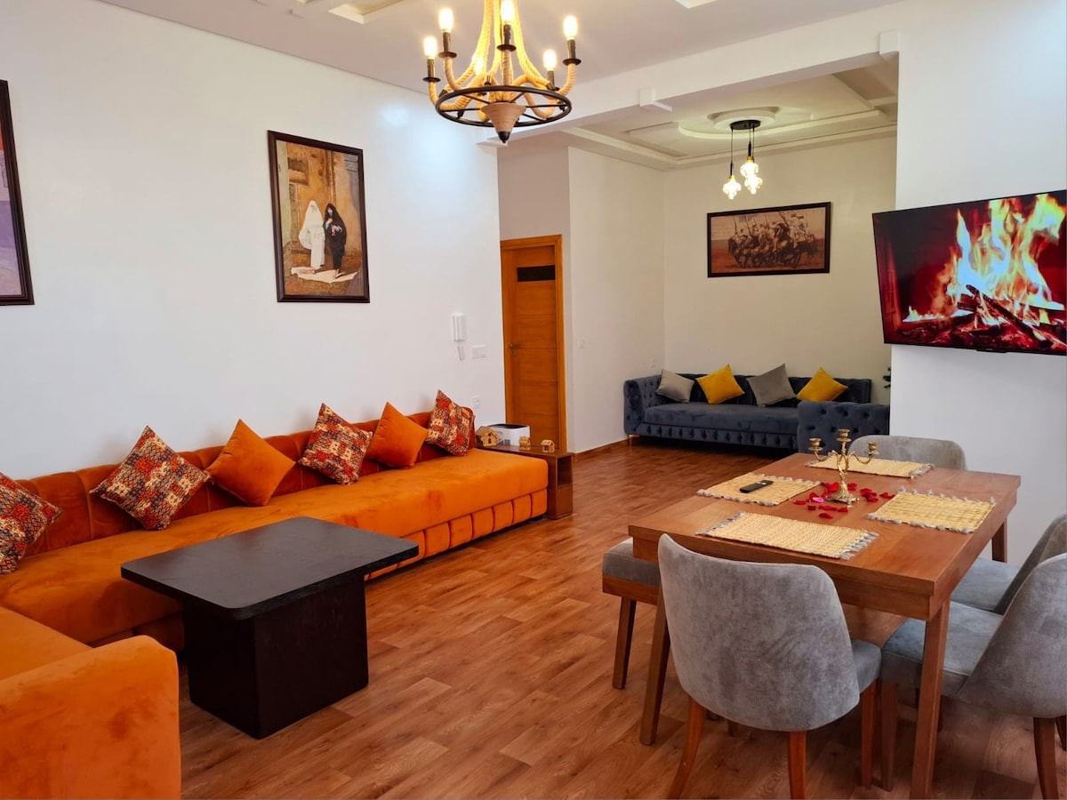 Bienvenue à Essaouira Installez-vous dans un appartement confortable et spacieux, situé à la Résidence Jawhara, une résidence calme et sécurisée 24h/24 avec parking gratuit juste devant. À seulement 4 minutes à pied de la plage, c’est le logement idéal pour profiter d’Essaouira sans voiture, tout en restant à l’écart du bruit touristique.