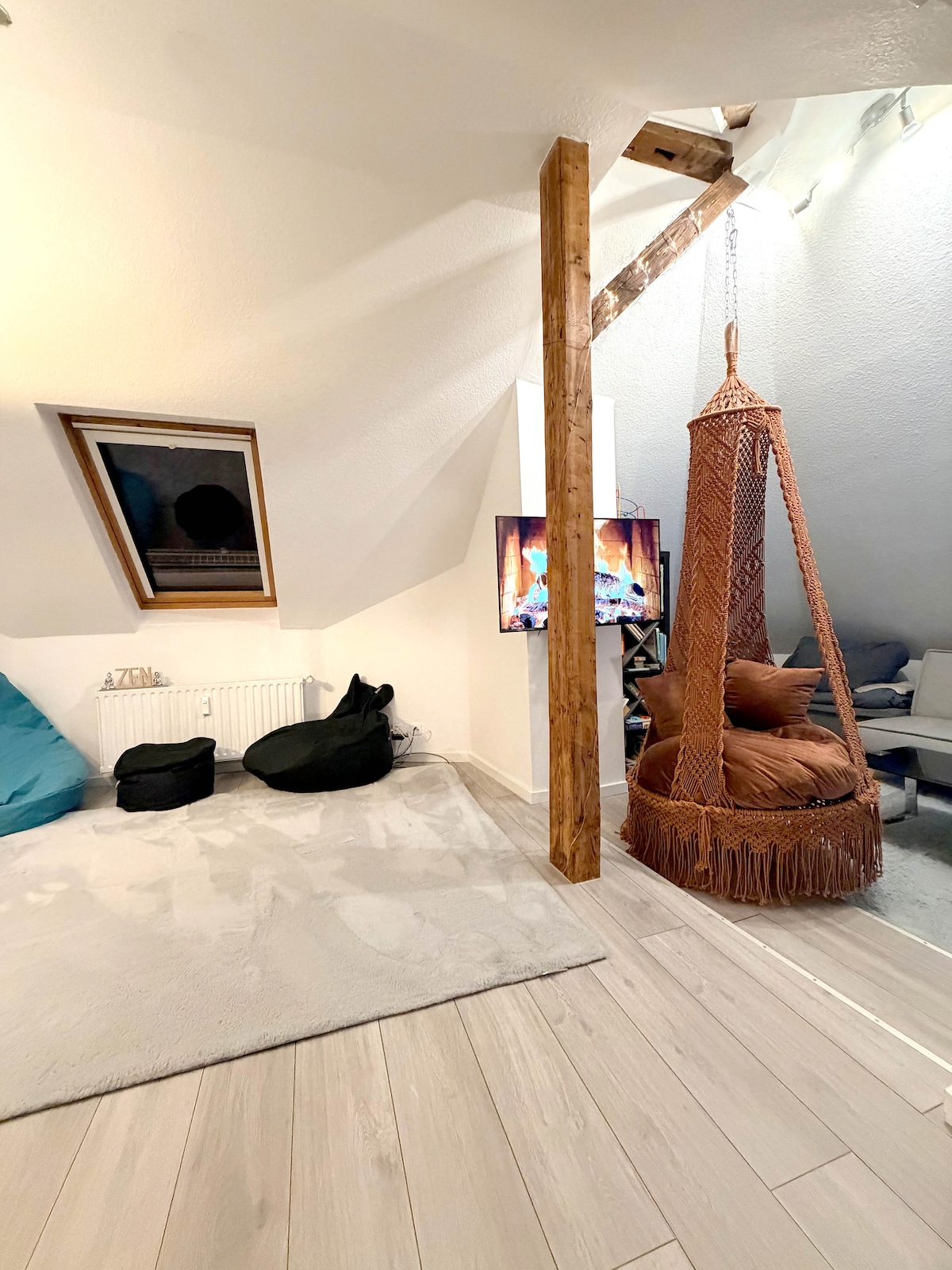Alquilamos un apartamento renovado en 2019 en el ático de nuestra casa unifamiliar. La casa es de los años 20 y en ese entonces albergaba a los trabajadores de una fábrica de Krupp. Al renovar la casa y el ático, era importante para nosotros preservar el carácter antiguo de la casa y complementarlo con elementos modernos. El asentamiento de Heimaterde es un edificio protegido, lo que significa que el carácter uniforme con los hermosos jardines se ha conservado en gran medida.