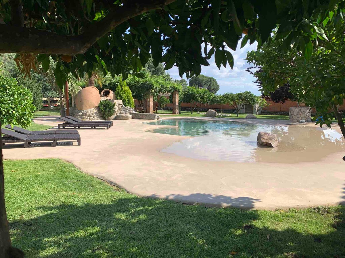 Una parcela de 3000 m2 de jardín y 2 casas separadas, con parque infantil, huerto ecológico, invernadero, árboles frutales y zona chill out. Tranquilidad, gargantas, montañas, aves, todo un paraíso para los sentidos. La Lagunilla Golf será su reencuentro con la naturaleza para disfrutar con la familia o los amigos, situada a los pies del Almanzor, en Candeleda, a 3 Km de Madrigal de la Vera y del embalse del Rosarito. A 500 metros del campo de golf con pádel. Es área protegida natural.