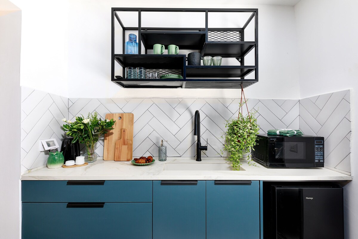 De Green Suite takes inspiration from the urban nature of the city and Shenkin Street. Its shades of green and bright colors create a serene and peaceful atmosphere, with a view of the beautiful Shenkin Garden visible from its windows. special artistic touches were commissioned, The suite includes one bedroom with satin bedding, equipped kitchen, dishwasher, refrigerator, espresso machine, smart TVs, luxurious bathroom , advanced air conditioning, safe. PRIVATE SHELTER IN THE BUILDING