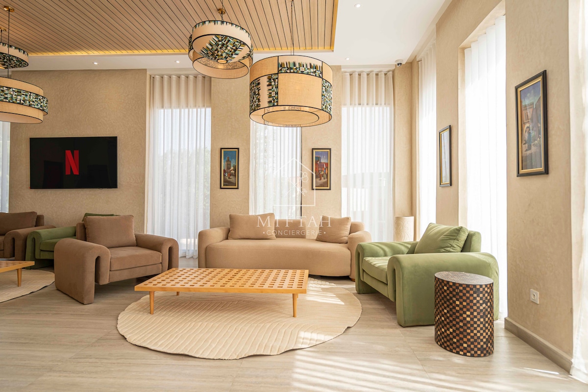 🌟 Suite Azul Celeste - Elegancia Disfruta de una estancia inolvidable en la suite única de nuestra casa de huéspedes Dar Laziza en el barrio Nouinouich de Tánger, con una magnífica vista de la piscina y los espacios verdes. Amplia y refinada, es ideal para familias o amigos que buscan comodidad, independencia y serenidad. Estamos en soft opening, algunas instalaciones todavía están en curso y pueden tener lugar trabajos ligeros. El servicio de cocina aún no está disponible.