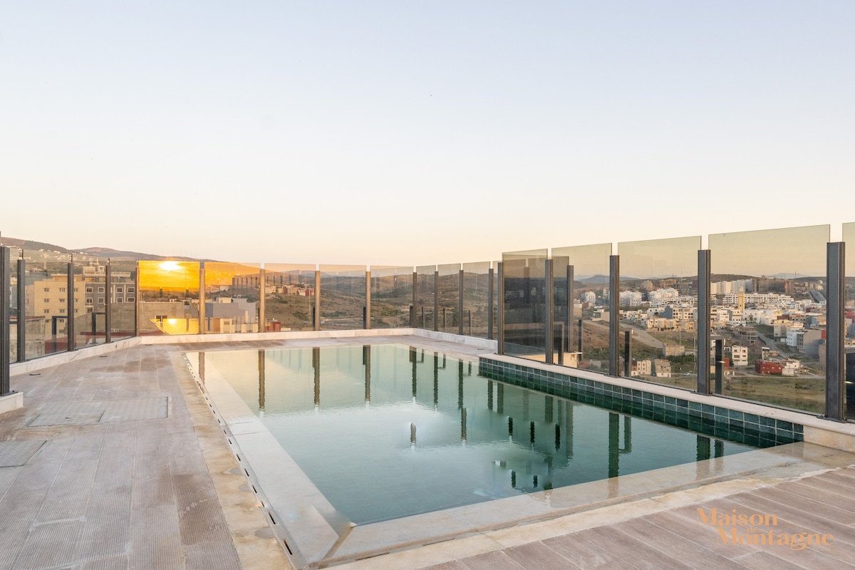 Stylish duplex in Residence Sania, Tangier, with 3 bedrooms, 2 bathrooms, and a large rooftop terrace with pool and sea views. Just 5 minutes to the beach, close to cafés (Cappuccino, RR Ice, La Vue) and Carrefour supermarket. High-end finishes, air conditioning, and free parking. Also 24-hour surveillance. Perfect for a peaceful stay. No parties or groups. Seasonal pool – please check availability.