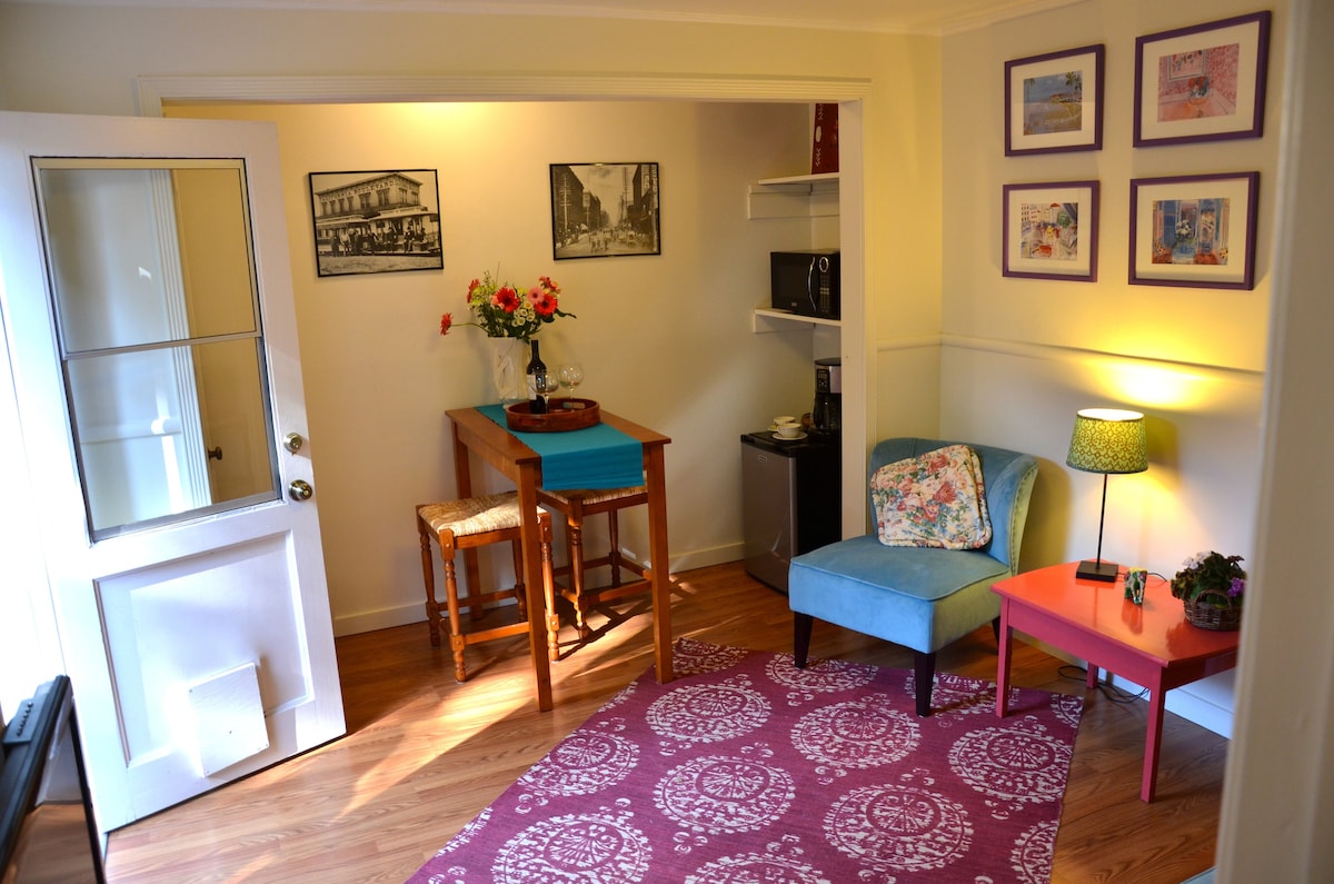 Apartamento aislado pero céntrico y acogedor de dos habitaciones, a un minuto a pie del centro de la ciudad (restaurantes y cafeterías literalmente a la vuelta de la esquina). Una entrada privada se abre a un patio lleno de flores. Tenemos nevera, microondas y cafetera. Hay una cama tamaño queen muy cómoda y una otomana que se despliega para convertirse en una espaciosa cama individual.