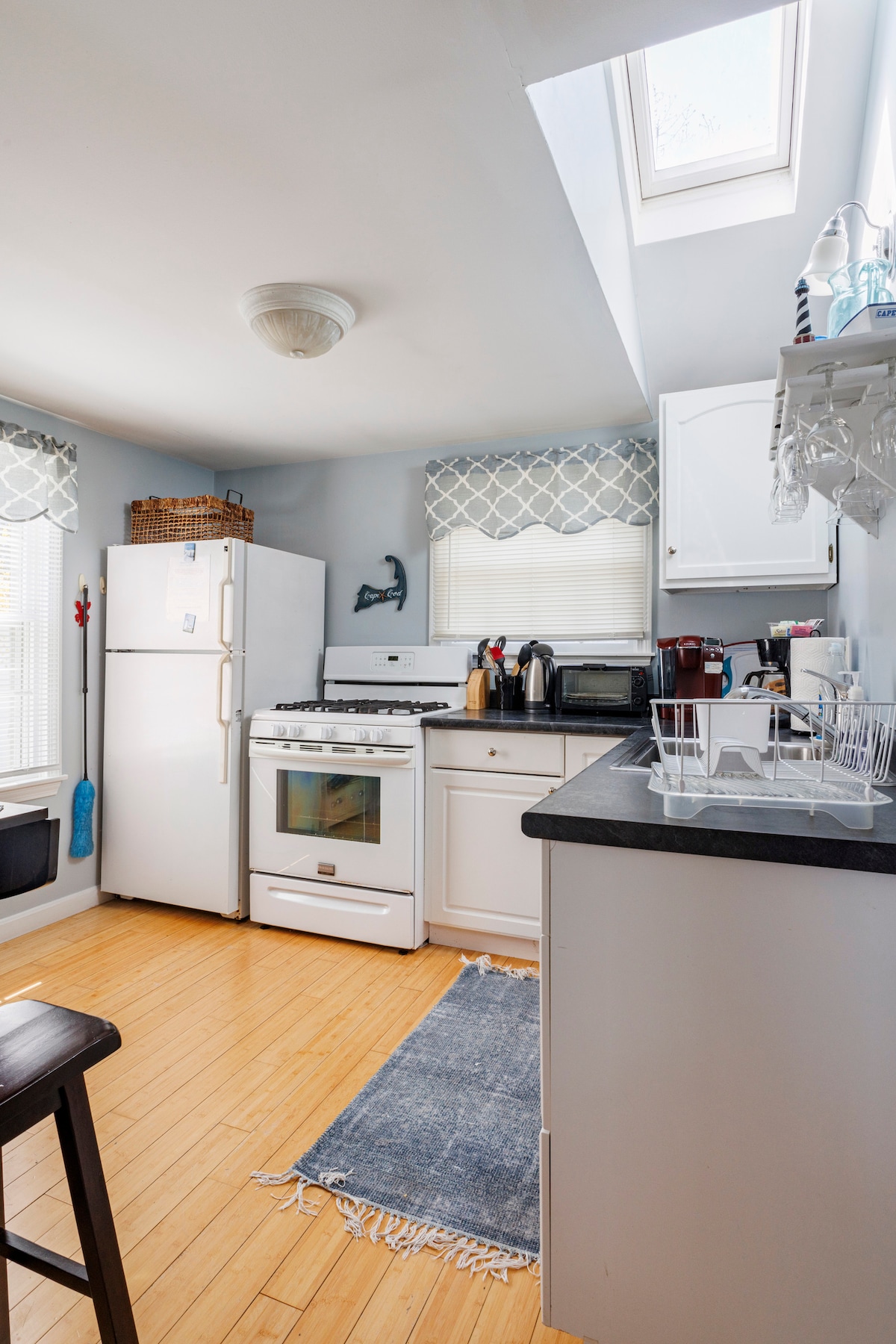 Esta es una casa de campo de dos dormitorios completamente reformada. Tres televisores inteligentes de pantalla plana. Wifi. Azulejos por todas partes. Esta unidad es llave en mano y está totalmente equipada. Hay una sala de estar exterior, un amplio patio trasero privado que incluye una parrilla de gas. La cocina está bien equipada e incluye salpicadero de azulejos, electrodomésticos de acero inoxidable, encimeras de cuarzo y mucho más. Estamos a media manzana de la calle principal, a dos manzanas del puerto y de los transbordadores de Martha's Vineyard. También estamos a menos de una milla del mar.
