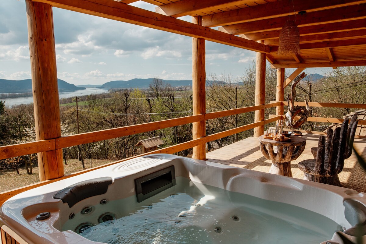 Acogedora cabaña de madera con chimenea y vistas a la curva del Danubio