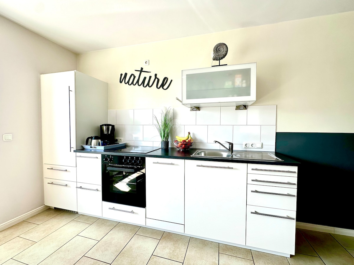 Unsere stilvoll dekorierte, kleine Ferienwohnung, freut sich auf Euch als Gäste! Der kombinierte Wohn- Schlafbereich ist sehr modern und liebevoll eingerichtet. Der Schlafbereich verfügt über ein großes Doppelbett, einen TV, richtig gutes WLAN, sowie eine gemütliche Eck-Couch. Die großzügige Einbauküche verfügt über einen Backofen, Induktionskochfeld sowie Geschirrspülmaschine, großen Kühlschrank inkl. Gefrierfach und zahlreiche Küchenutensilien.