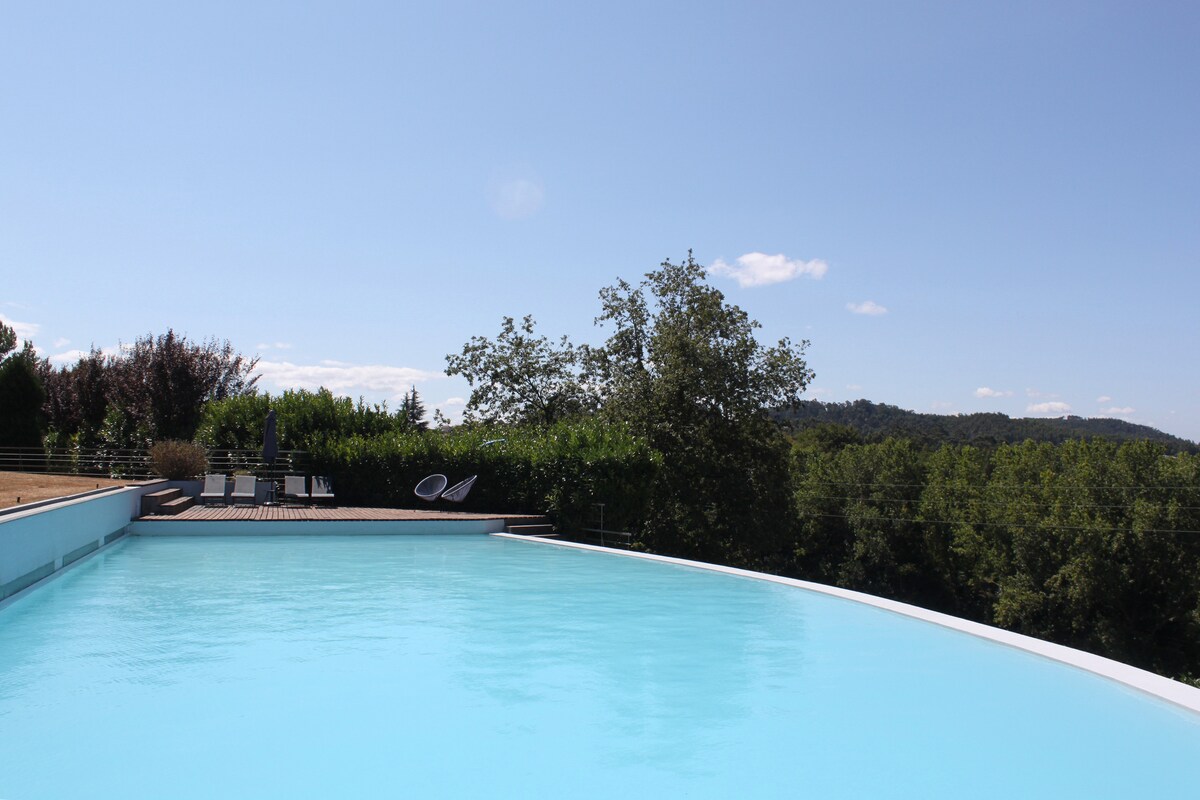 Aproveite para relaxar numa envolvente calma neste anexo totalmente privado junto à nossa casa. Terá acesso a uma piscina com uma vista deslumbrante e idílica sobre a natureza envolvente. Quarto com cama e possibilidade de um sofá cama extra privado. A cozinha, bem equipada, e o WC são absolutamente privados. Lugar de garagem ao dispor dos hóspedes