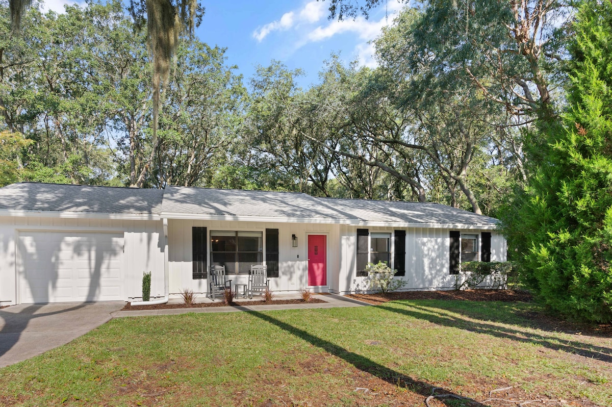 Welcome to the Pink Pheasant: cruise to the beach or downtown with Lenny, the lime green golf cart. You'll be only 5 mins to the beach/7 to downtown! Lenny (golf cart) is included: 6 seater (saves $120/day in rental fees) Features - 2 separate living spaces (family friendly) - Fire Pit/Patio/Gas Grill - Yard games - 4 bedrooms (2 kings) - 1 Gig WiFi w/4 smart TVs - Family game night w/board games - Beach chairs/cart/towels/tent - Keurig w/Dunkin coffee Book your Amelia Island beach getaway!