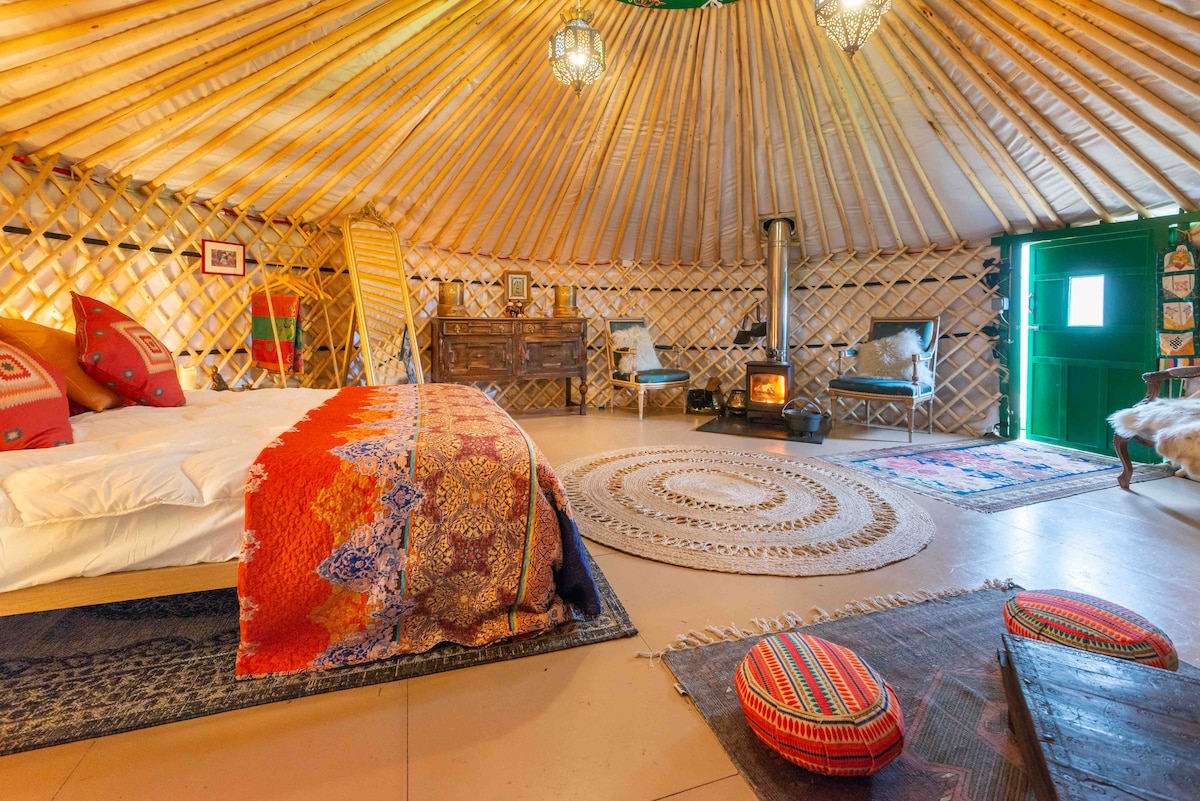Construida a mano por mí y por la abuela Mongolia, la yurta es una mezcla de diseño tradicional mongol y bohemio chic. Al entrar en la yurta, notarás al instante una sensación de calma y conexión con la tierra, un refugio ideal para escapar de un estilo de vida agitado. Rodeada de campo, la yurta alberga muchos artefactos mongoles que me regaló la abuela Mongolia. Cuenta con una barbacoa de carbón y una estufa. En el exterior hay un gran comedor, cocina al aire libre y baño al aire libre. Espacio apto para niños. Visto en BBC2 My Unique B&B.