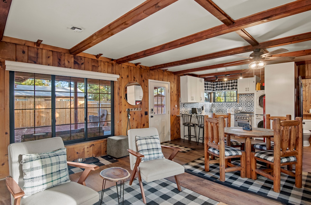 Hidden two-bedroom, one-bath gem in the tall pines close to historic Downtown Flagstaff shops & restaurants, NAU, Route 66, parks & hiking trails. Upgraded retro appliances, central heat & air conditioning, fully fenced yard with outdoor furniture, front porch, BBQ, Adirondack chairs, fire pit, and picnic table. Living room sofa and club chairs. One king bed and one queen. SmartTVs in the living room and bedrooms w/speedy 1-gig WiFi. Full-size washer/dryer. Parking for two cars. Dog-friendly.