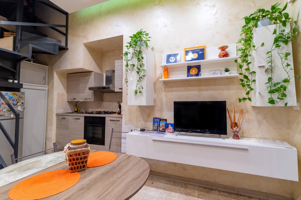 Estudio de diseño en el centro de Catania ubicado en un edificio de estilo industrial recientemente renovado en una zona estratégica y bien servida. Pilares de hormigón a la vista, ventanas grandes, cortinas opacas y suela de madera en la fachada exterior. Tiene una cocina nueva sin perchas, con estantes grandes y barras LED, lavavajillas incorporado, nevera con congelador de suelo y estufa con 4 estufas de inducción y área de lavandería.