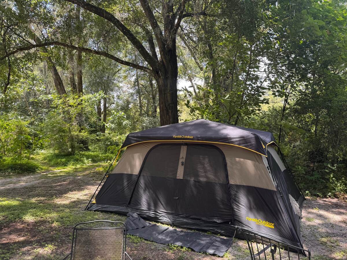Relájate en Serenity Acres, tu refugio privado de glamping, ubicado en medio de 10 acres de bosques y campos. Disfruta de las noches más frescas de Florida junto al fuego y los días cálidos y soleados. Nuestra espaciosa tienda de campaña de 20 pies ofrece todas las comodidades de un hogar, incluida una lujosa cama tamaño king, una acogedora zona de estar, aire acondicionado y calefacción. Hay un baño completo en la propiedad solo para tu uso personal, como huéspedes de tienda de campaña. ¡Dúchate bajo la luna con agua caliente ilimitada! ¡Relájate en el fuego, bajo las brillantes estrellas del campo!