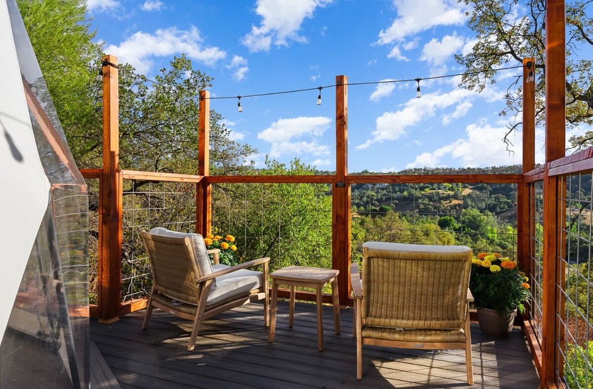 Our Glamping geo dome- This Dome away from home in the beautiful rolling hills of Newcastle California is anything but ordinary. And you will cherish your memories from here forever! Experience the ultimate glamping getaway in our beautiful Boho inspired dome with luxurious bedding, full sized private bathroom, and butcher block countertop kitchen.