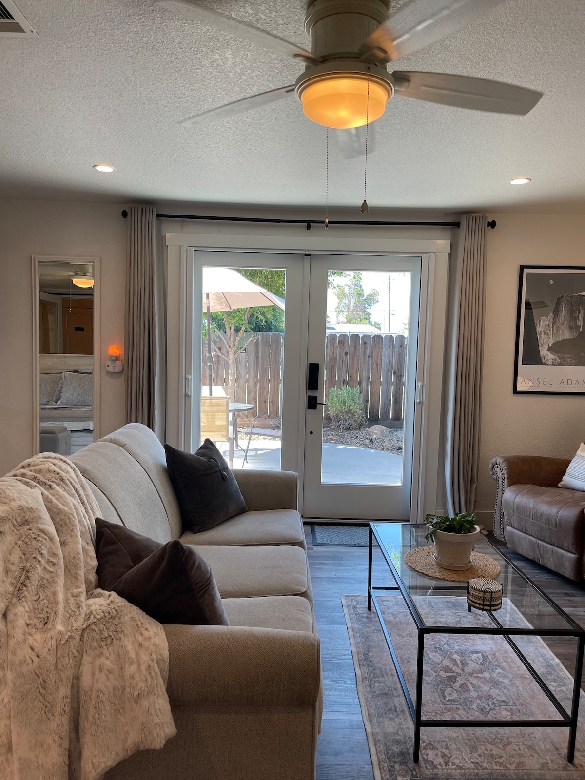 Mejorado y espacioso 2 dormitorios/1 baño, sala de estar y comedor separado, electrodomésticos, muebles todos nuevos, a 10 minutos del aeropuerto, gran acceso (70 minutos) a los parques nacionales (Yosemite, Sequoia, Kings Canyon, etc.), patios delanteros y traseros vallados, wifi de alta velocidad de 300 MB, suelos de madera, TV de 65 pulgadas con DIRECTV + Netflix, parrilla de propano para barbacoa, todos los elementos esenciales de cocina, incluida licuadora y cafetera. 1 cama tamaño queen, 1 litera completa y 1 sofá cama completo. 3 coches aparcados de forma segura en la entrada dentro de la valla de la puerta.