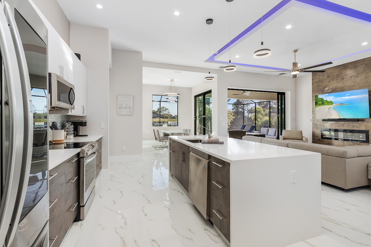Hermosa y moderna casa de NUEVA construcción con piscina climatizada, en canal de agua salada. Sin daños después del huracán Milton. DIVERSIÓN para familias y tranquilidad para adultos; totalmente equipado con mesa de juegos electrónicos, juguetes y flotadores de piscina, juegos al aire libre, juegos de arcade, juegos de mesa... ¡mucho para disfrutar! ¡Disfruta de la vida interior/exterior en el amplio lanai estilo resort y refúgiate en los elegantes acabados y lujosas comodidades en todas partes!